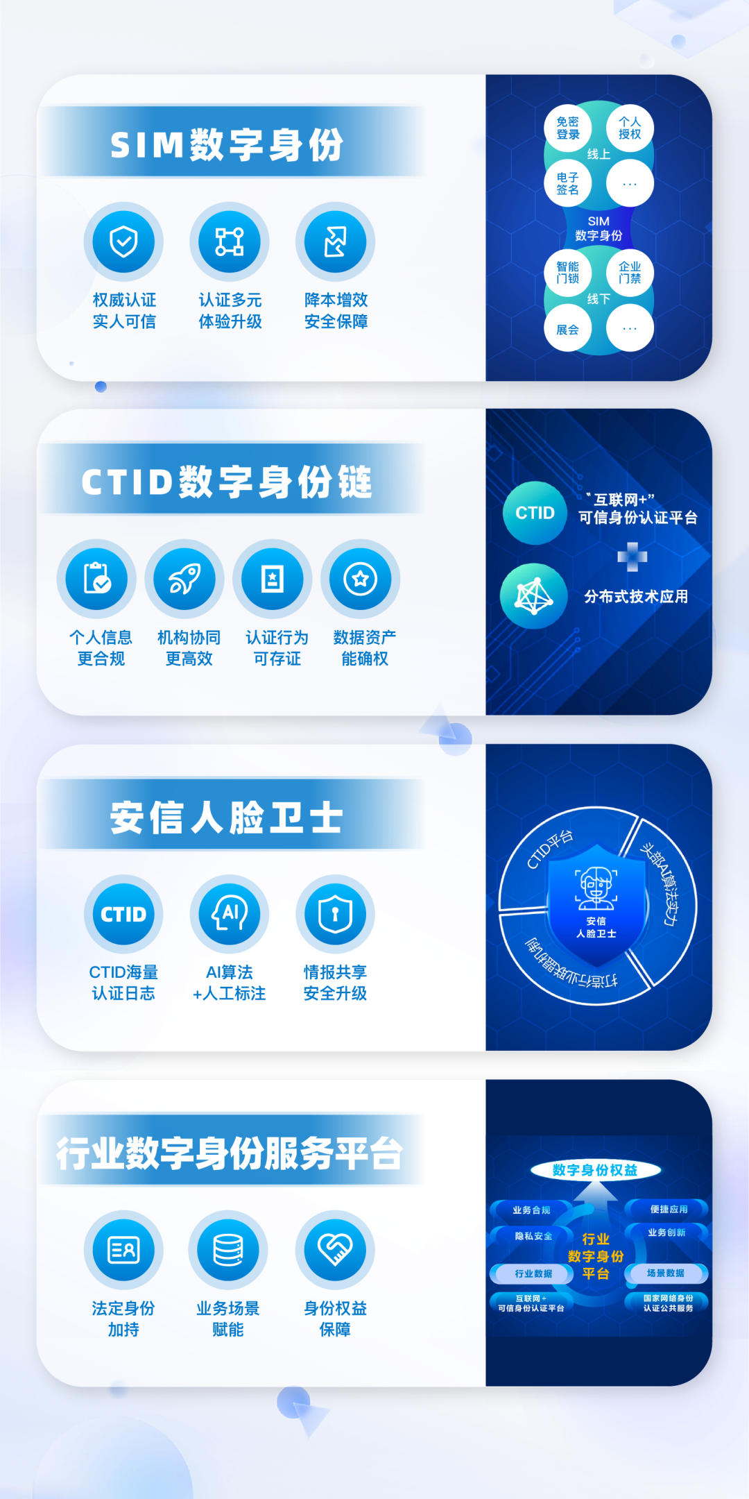 一是SIM数字身份产品。公司与三大运营商合作打造的SIM数字身份产品成为生态共建的优秀代表,通过打造超级SIM卡统一入口,将可信数字身份与SIM卡绑定,集成了可信身份认证能力以及带国密算法的超级SIM卡,实现NFC便捷应用,形成强强联合的创新数字身份服务。